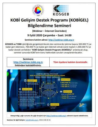 TOBB ve KOSGEB işbirliği ile 9 Eylül 2020 tarihinde gerçekleştirilecek olan “KOBİ Gelişim Destek Programı (KOBİGEL) Bilgilendirme Semineri hakkındaki duyuru aşağıda yer almaktadır.
