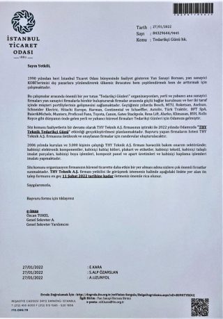 Söz konusu faaliyetlerin bir devamı olarak THY Teknik A.Ş. firmasının iştiraki ile 2022 yılında Odamızda THY Teknik Tedarikçi Günü” etkinliği gerçekleştirilmesi planlanmaktadır. Başvuru yapan firmaların listesi THY Teknik A.Ş. firmasına iletilecek ve onaylanan firmalar için randevular oluşturulacaktır.