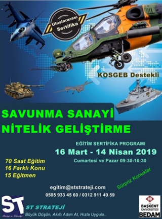 - Yerli ve Milli esaslar çerçevesinde gelişmeye devam eden Savunma Sanayimizin Ülkemiz açısından bilinen önemine binaen Başkent Üniversitesi işbirliğinde hazırladığımız “Savunma Sanayi Nitelik Geliştirme” Sertifika Programı 16 Mart 2019 tarihinde başlayacak ve 4 hafta boyunca Cumartesi-Pazar günleri 9.30-16.30 saatleri arasında yapılacaktır.