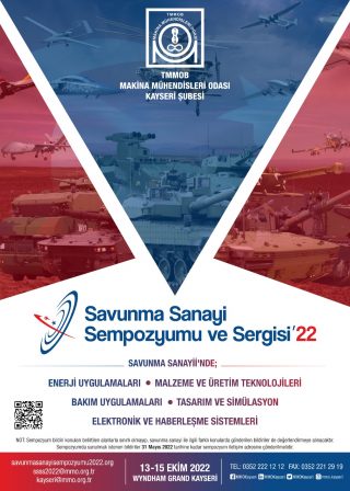 Makina Mühendisleri Odası Kayseri Şubesi olarak 13-15 Ekim 2022 tarihlerinde, Sayın Bakanımız Hulusi AKAR’ ın ve ilgili firmaların katılımı ile Kayseri’de gerçekleşecektir. Bu konu ile ilgili Şube Yönetim Kurulu Üyemiz Sn. Ayşe YAKUT’ un telefonda bahsettiği üzere İlgi ve desteklerinizi beklemekteyiz. Bildiri kabul tarihimiz 30 Haziran 2022 tarihine kadar uzatılmıştır. İlgili belgeler ek’te tarafınıza iletilmiş olup, detaylı bilgi için web adresimiz http://savunmasanayisempozyumu2022.org/ inceleyebilirsiniz.