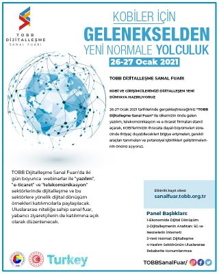 26-27 Ocak 2021 tarihlerinde düzenlenecek TOBB DİJİTALLEŞME SANAL FUARI “Gelenekselden Yeni Normal’e Yolculuk” ile KOBİ’lerimizin dijital dönüşümünü tetiklemek ve bu alandaki bilgi ve erişim eksikliğini gidermek amacıyla Birliğimiz uhdesinde bilişim çatısı altında bir araya geliyoruz. Detaylı bilgi ekte sunulmaktadır.